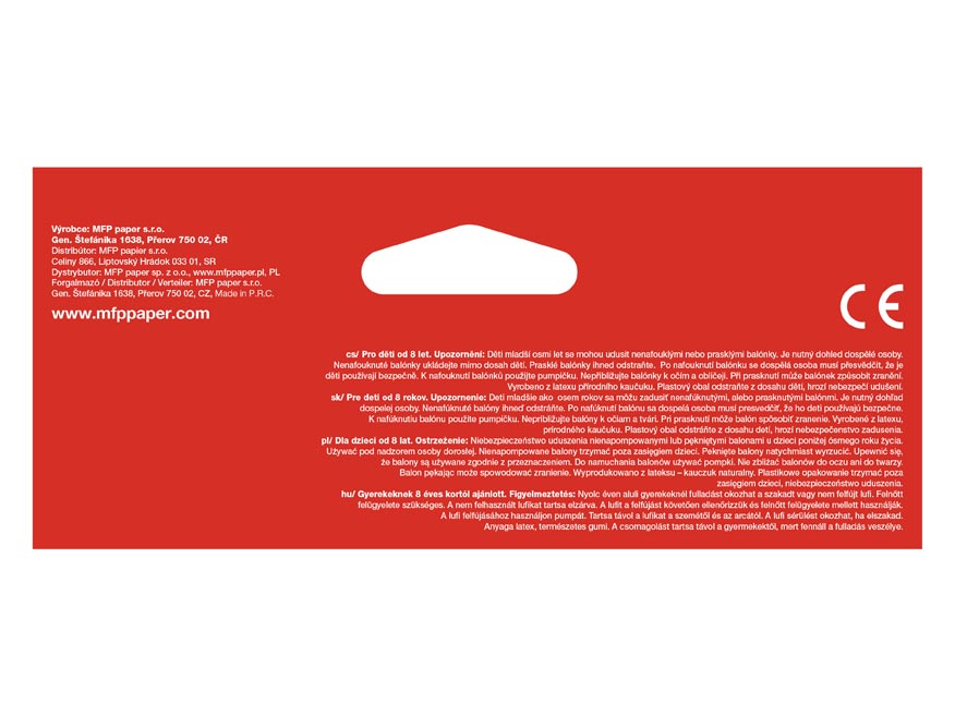 Vhodné pro děti od 8 let. Děti se mohou prasklými či vyfouknutými balónky zadusit nebo uškrtit. Používejte pouze pod dozorem dospělé osoby. Dospělá osoba se po nafouknutí balónku musí přesvědčit, že jej děti používají bezpečně. Vyfouklé balónky udržujte mimo dosah dětí a prasklé ihned zlikvidujte. K nafukování balónků použíjte pumpičku. Nepřibližujte balónky k očím a obličeji. Při prasknutí může balónek způsobit zranění. Vyrobeno z přírodního kaučuku, latexu. Určeno k dekorativním účelům. Nebezpečí vdechnutí a spolknutí malých částic.