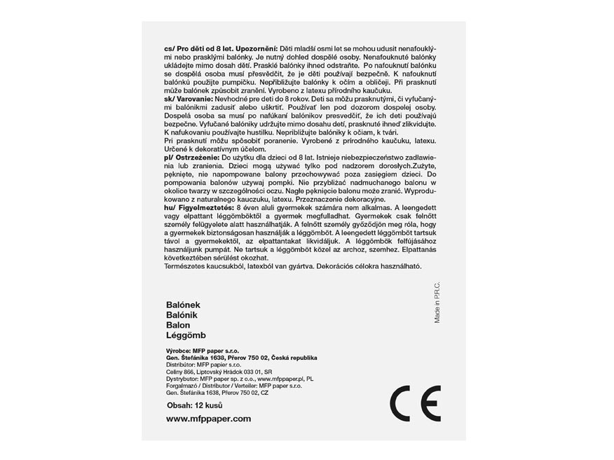 Vhodné pro děti od 8 let. Děti se mohou prasklými či vyfouknutými balónky zadusit nebo uškrtit. Používejte pouze pod dozorem dospělé osoby. Dospělá osoba se po nafouknutí balónku musí přesvědčit, že jej děti používají bezpečně. Vyfouklé balónky udržujte mimo dosah dětí a prasklé ihned zlikvidujte. K nafukování balónků použíjte pumpičku. Nepřibližujte balónky k očím a obličeji. Při prasknutí může balónek způsobit zranění. Vyrobeno z přírodního kaučuku, latexu. Určeno k dekorativním účelům. Nebezpečí vdechnutí a spolknutí malých částic.