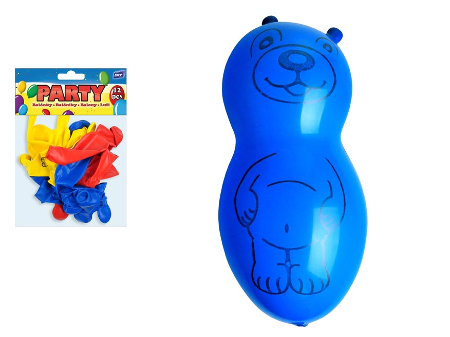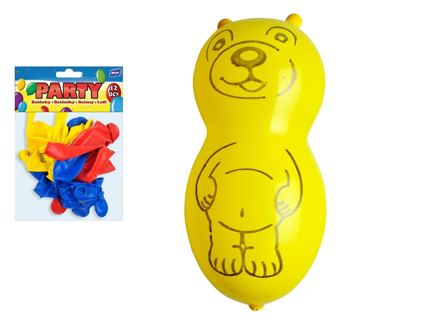 – 12 ks barevných balónků ve tvaru medvěda (červená, žlutá, modrá)