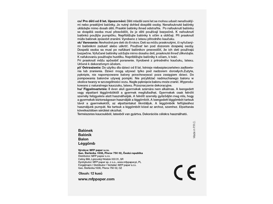 Vhodné pro děti od 8 let. Děti se mohou prasklými či vyfouknutými balónky zadusit nebo uškrtit. Používejte pouze pod dozorem dospělé osoby. Dospělá osoba se po nafouknutí balónku musí přesvědčit, že jej děti používají bezpečně. Vyfouklé balónky udržujte mimo dosah dětí a prasklé ihned zlikvidujte. K nafukování balónků použíjte pumpičku. Nepřibližujte balónky k očím a obličeji. Při prasknutí může balónek způsobit zranění. Vyrobeno z přírodního kaučuku, latexu. Určeno k dekorativním účelům. Nebezpečí vdechnutí a spolknutí malých částic.