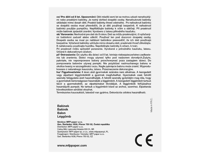 Varování: Pro děti od 8 let. Děti mladší 8 let se mohou udusit nenafouklými nebo prasklými balónky. Je nutný dohled dospělé osoby. Nenafouknuté balónky ukládejte mimo dosah dětí. Prasklé balónky ihned odstraňte. Po nafouknutí balónku se dospělá osoba musí přesvědčit, že je děti používají bezpečně. K nafouknutí balónků použijte pumpičku. Nepřibližujte balónky k očím a obličeji. Při prasknutí může balónek způsobit zranění. Plastový obal odstraňte z dosahu dětí, hrozí nebezpečí udušení.