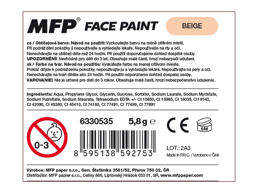 Barva na obličej béžová, na principu rtěnky (6 g). Díky těmto pestrým barvám vykouzlíte na tváři dítěte krásnou masku na karneval, párty nebo jinou oslavu. Dermatologicky testováno.
