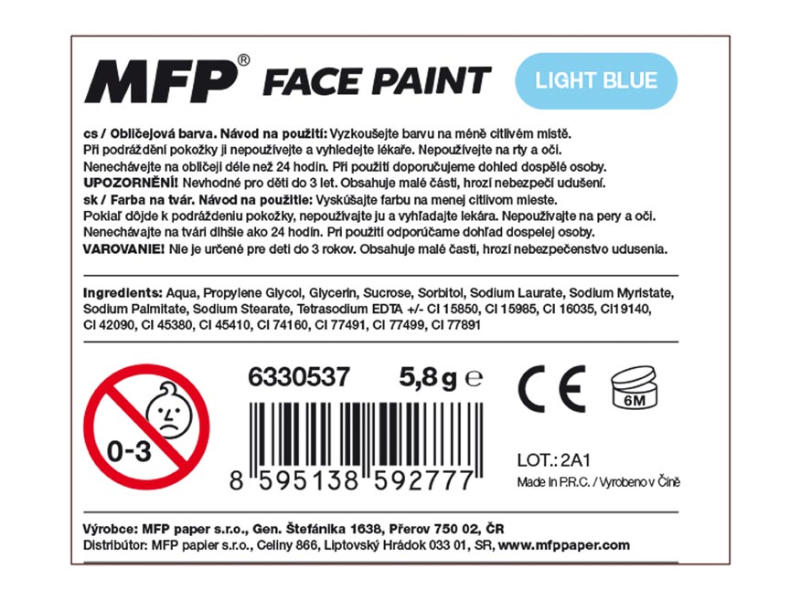 Barva na obličej světle modrá, na principu rtěnky (6 g). Díky těmto pestrým barvám vykouzlíte na tváři dítěte krásnou masku na karneval, párty nebo jinou oslavu. Dermatologicky testováno.