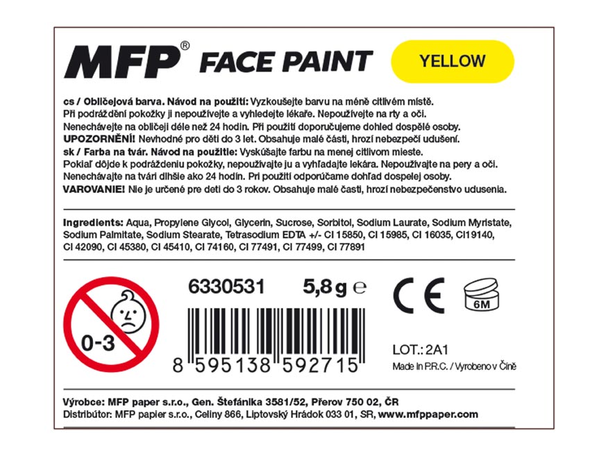 Barva na obličej žlutá, na principu rtěnky (6 g). Díky těmto pestrým barvám vykouzlíte na tváři dítěte krásnou masku na karneval, párty nebo jinou oslavu. Dermatologicky testováno.