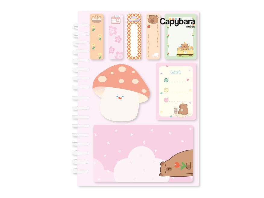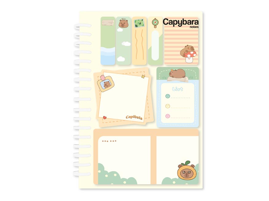 Samolepicí set bločků se spirálou je roztomilý i praktický pomocník pro všechny, kdo si rádi zapisují, připomínají, plánují… a milují kapybary! Obsahuje mix různě velkých bločků na poznámky, úkoly i drobné vzkazy.