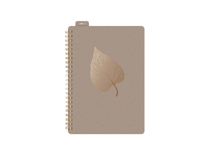Elegantní poznámkový blok ve formátu A5 s linkovanými stránkami a spirálovou vazbou je navržen pro ty, kdo hledají styl a praktičnost v jednom. Obálka v teplém hnědém odstínu je doplněna o jemný zlatý motiv listu, který bloku dodává nádech přírody a sofistikovanosti. Gumička udržuje blok pevně zavřený, aby vaše poznámky zůstaly chráněné, a záložka „notes“ vám pomůže rychle se zorientovat na správné stránce.
