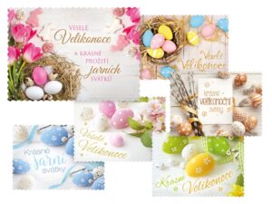Pohlednice s velikonočním motivem. Text na zadní straně obsahují 3 pohlednice z 6. Text na přední straně: Krásné Velikonoce, Veselé Velikonoce, Veselé Velikonoce a krásné prožití jarních svátků, Krásné velikonoční svátky, Krásné jarní svátky Text na zadní straně: Pohlednice 1: Veselé Velikonoce a hodně radosti z prvních jarních paprsků přeje Pohlednice 2: Příjemné prožití velikonočních svátků a krásné jaro přeje Pohlednice 3: Krásné prožití velikonočních svátků a bohatou pomlázku ze srdce přeje Pohlednice 4-6 bez textu Text: 3/6 Papír: pohlednicový karton 240 g Povrchová úprava: výsek + UV lak Dodáváme v mixu po 6 ks dle skladové zásoby. Uvedená cena je za 1 ks.