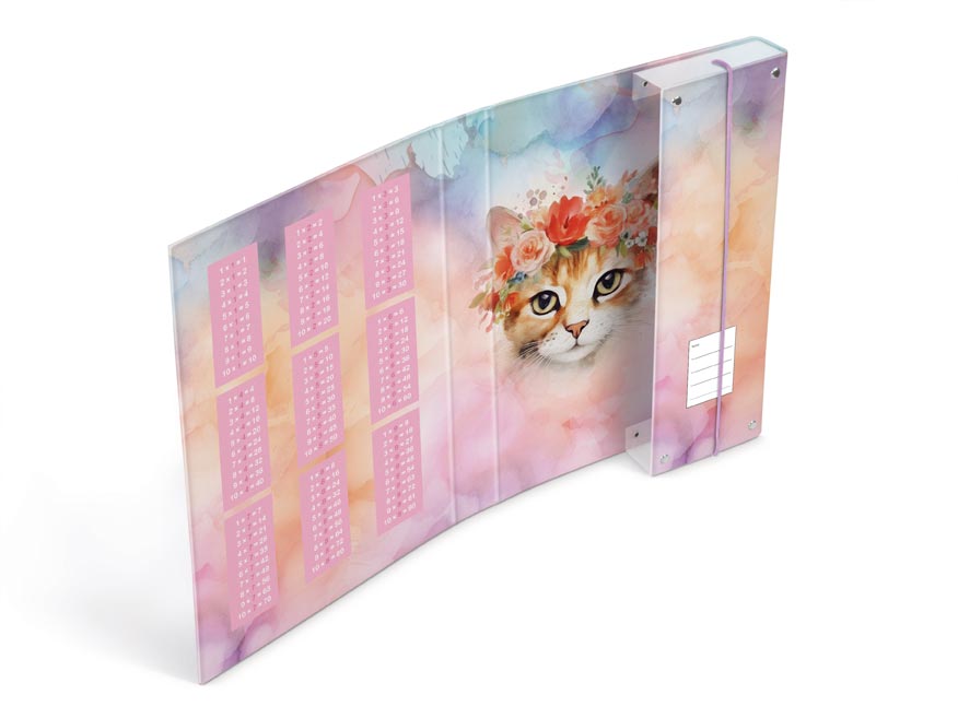 Tyto praktické desky ve formátu A4 s hravým motivem kočky zajistí, že všechny školní pomůcky budou chráněné a uspořádané. Pevný lepenkový karton s laminem odolá každodennímu používání a elastická gumička drží vše bezpečně uvnitř.