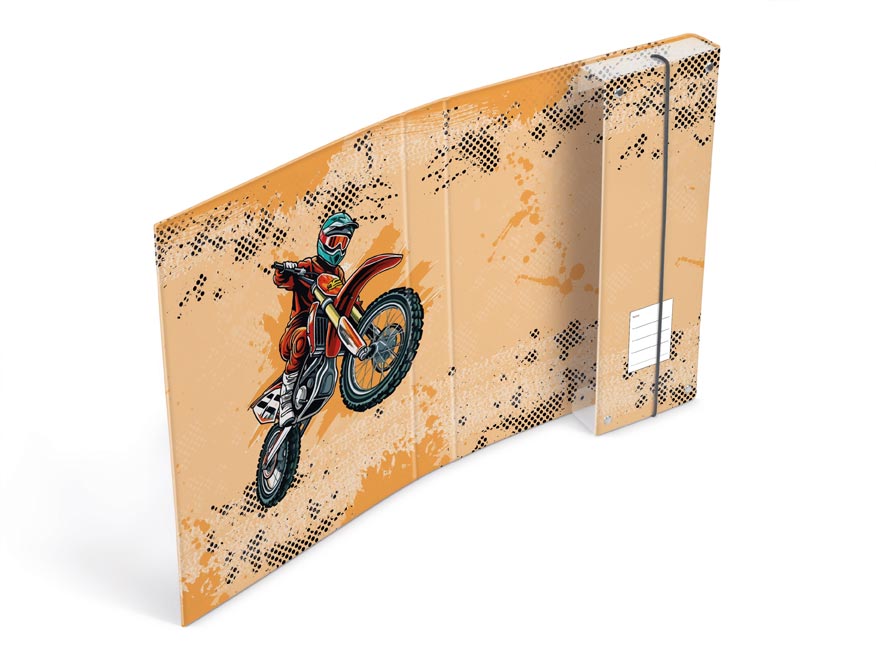 Školní desky na sešity ve formátu A5 s motivem motokrosové motorky jsou nezbytnou součástí vybavení každého školáka. Desky jsou vyrobeny z kvalitního lepenkového kartonu potaženého laminem, který spolehlivě chrání sešity a další školní potřeby před poškozením. Díky praktické gumičce drží obsah bezpečně uvnitř, takže se sešity ani pracovní listy nepomačkají a zůstanou vždy v pořádku. S těmito veselými deskami bude každý den ve škole o něco zábavnější!
