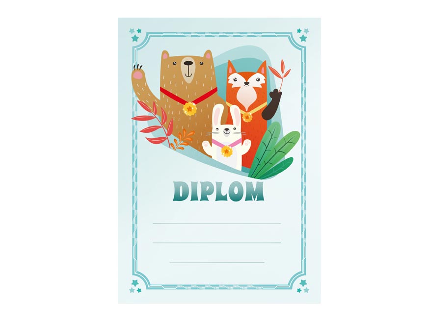 Potěšte malé šampiony originálním diplomem, který jim vykouzlí úsměv na tváři! Barevný dětský diplom ve formátu A4 s veselými ilustracemi medvěda, lišky a králíčka je skvělým způsobem, jak ocenit výkon, snahu nebo účast
