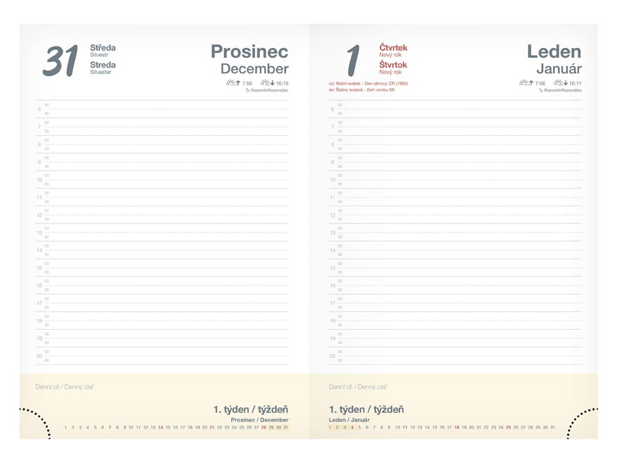 Obálka je vyrobena z měkkého materiálu s povrchem PU soft – sametově hebkého na dotek a odolného vůči každodennímu používání. Odtrhávací spodní rožky umožňují snadné a rychlé nalistování aktuálního dne – praktický detail, který oceníte při každodenním plánování. Uvnitř se nachází denní rozvržení, které nabízí dostatek prostoru pro poznámky, schůzky i úkoly.