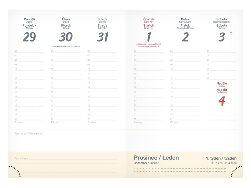 Obálka s matným laminem a parciálním lakem vytváří působivý kontrast mezi decentním matným povrchem a lesklými detaily, které zvýrazňují jemné barvy motivu a dodávají diáři elegantní vzhled. Odtrhávací spodní rožky usnadňují orientaci a pomáhají rychle najít aktuální týden. Praktické týdenní rozvržení poskytuje jasnou orientaci a umožňuje plánování celého týdne přehledně na jedné dvojstraně.