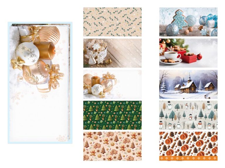 Celoplošně potištěné vánoční dopisní obálky DL s krycí páskou. Formát DL je dvojmo přeložený papír A4. Posíláte rádi vánoční dopisy? Jestli ano, tak si u nás pořiďte krásné dopisní obálky s vánočními motivy a nezapomeňte si u nás také objednat dopisní papír a propisku!