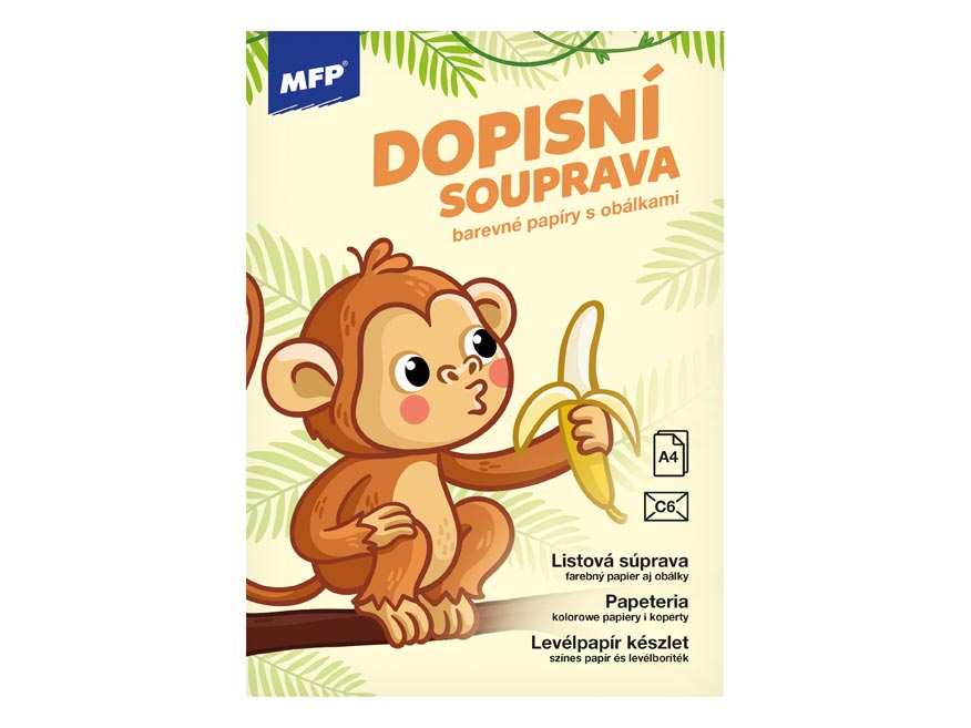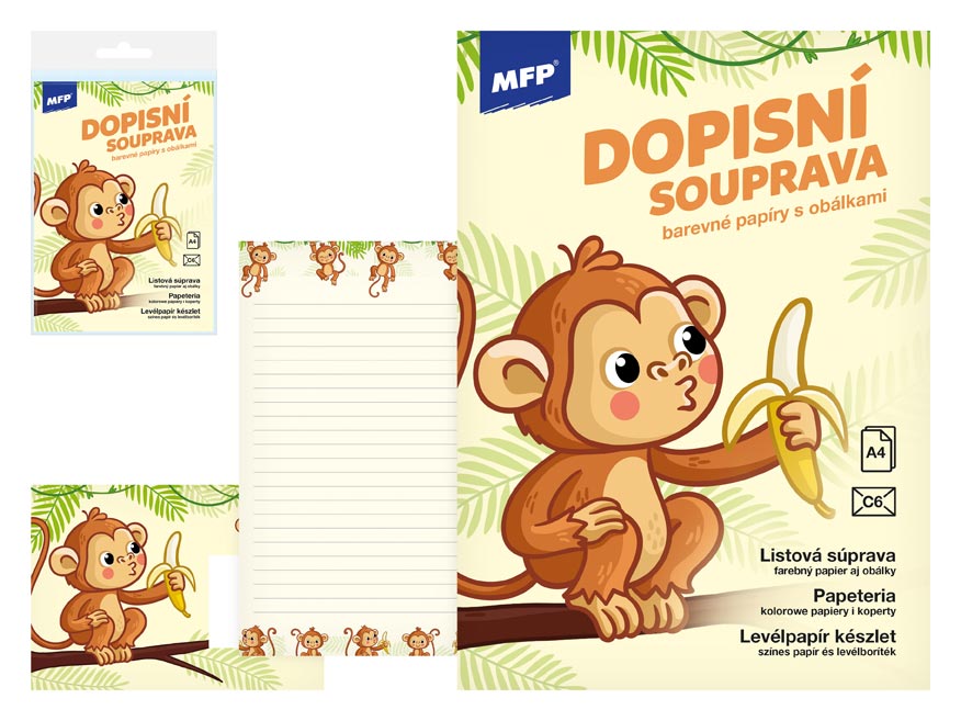 Dopisní souprava s obrázkem opice s banánem. Píšete rádi dopisy svým známým? Pořiďte si u nás krásné dopisní papíry s různými motivy a nezapomeňte ani na psací potřeby.