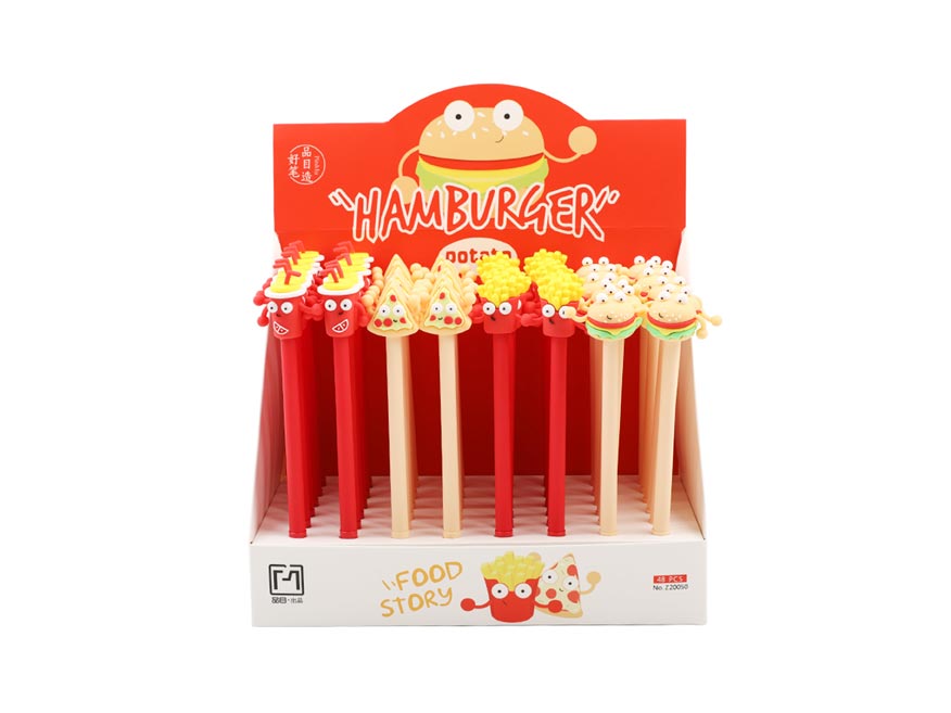 Gelové pero Fancy – Food Story s modrou náplní a hravými motivy oblíbených pochoutek, jako je pizza, hranolky, hamburger a nápoj. Obsahuje modrý inkoust a šíře stopy je 0,5 mm, což zajišťuje přesné a plynulé psaní.Pero je vybaveno víčkem pro ochranu hrotu před poškozením a má tělo z pružného, odolného plastu, příjemného na držení. Skvělý doplněk do školy, kanceláře nebo jako veselý dárek pro milovníky zábavných psacích potřeb.