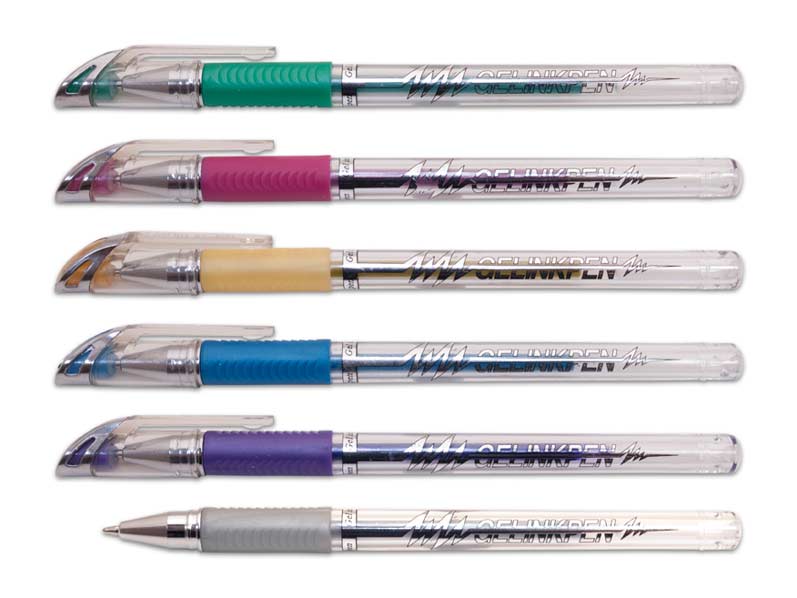 Set 6 ks gelových per v METALICKÝCH barvách s hrotem 1 mm. Vhodná pro školní, kancelářské, ale i domácí použití. Gelové pero má pogumovaný úchop, a tak zabraňuje klouzání v ruce.
