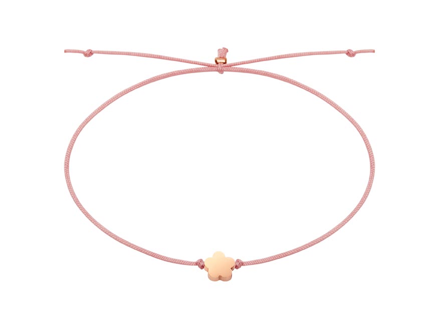 Na tenké textilní šňůrce je zavěšen drobný přívěsek ve tvaru květiny v růžově zbarveném provedení. Decentní design působí moderně a romanticky zároveň, takže náramky snadno doplní každodenní outfit a hodí se pro všechny věkové kategorie.
