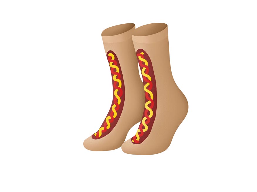 Ponožky HOT DOG z dárkové kolekce Gifty jsou malou dávkou humoru v praktickém balení. Na první pohled připomínají fastfoodovou klasiku, ve skutečnosti ale ukrývají měkký a pohodlný pár ponožek ve velikosti 43–45.