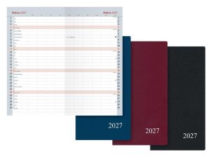 Pevná PVC obálka v decentních barvách (modrá, vínová, černá) působí profesionálně a dobře odolává každodennímu používání. Díky úzkému a praktickému formátu se diář snadno vejde do tašky, šuplíku nebo pracovní složky.