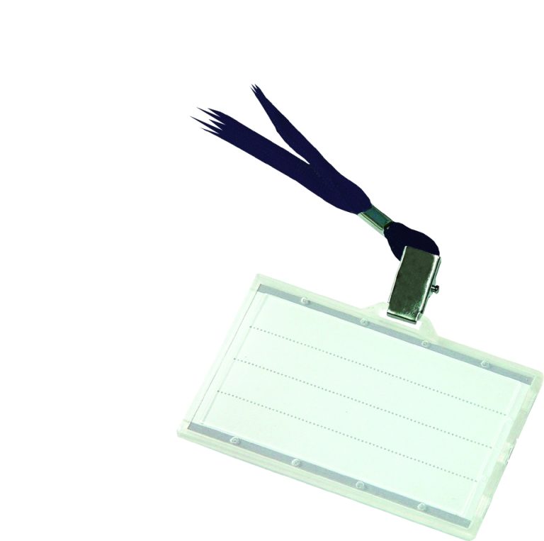 Identifikační jmenovka s úchytem formou krokodýlek s černou šňůrkou o délce 84 cm.