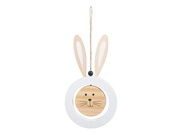 Krásná dřevěná velikonoční dekorace zajíc, v přírodní barvě, s otočnou hlavou v bílém kruhu