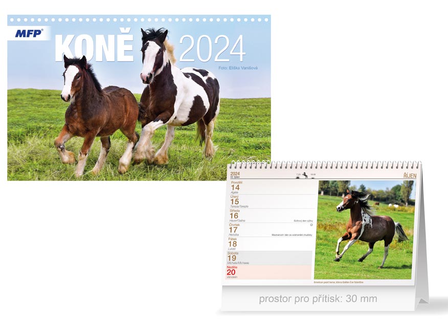 Stolní kalendář na rok 2024 s názvem Koně. Kalendář je určený pro milovníky koní. Vhodný pro zapisování důležitých poznámek, k organizování různých událostí každodenního života. Možnost dotisku firemního loga a textu na spodní stranu kalendáře.