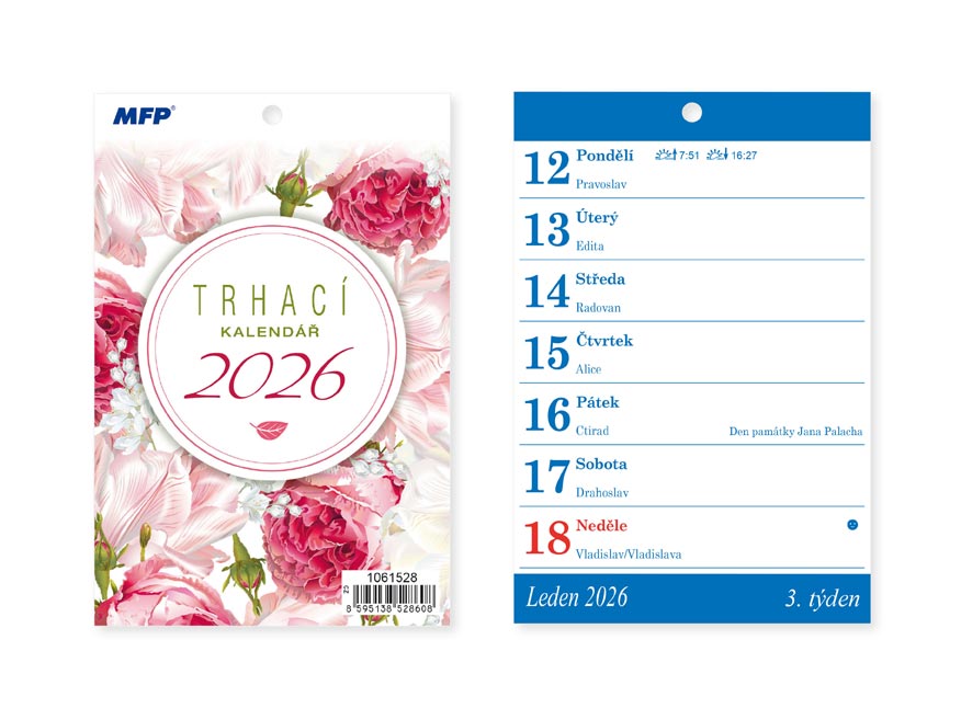 Trhací kalendář 2026 ve formátu A6 je praktickým pomocníkem pro každý den. Přehledné týdenní listy zobrazují sedm dní na jedné stránce, včetně českých jmen, svátků a časů východu a západu slunce. Díky kompaktnímu formátu se hodí i do menších prostor – ideální do kuchyně, na pracovní stůl nebo na nástěnku. Úvodní strana je ozdobena jemným květinovým motivem, který kalendáři dodává decentní a elegantní vzhled. Osvědčená klasika s praktickým využitím po celý rok.