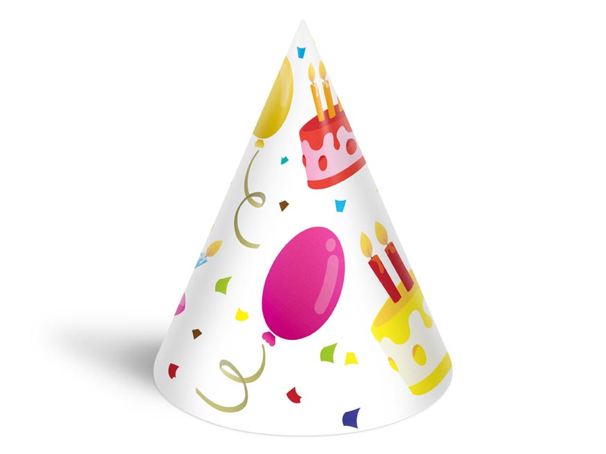Narozeninový papírový párty klobouček. Karnevalový klobouček velice dobře drží na hlavě, díky kloboukové gumičce, kterou si dáte pod bradu. Udělejte radost oslavenci a uspořádejte velkou párty. Nezapomeňte koupit i frkačky a trumpety.