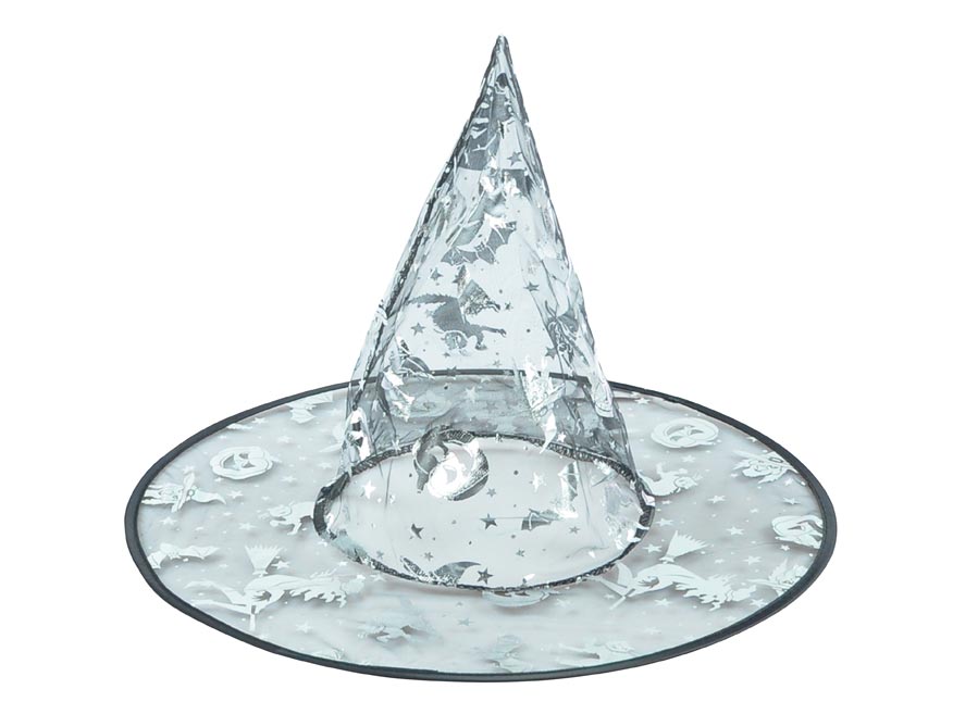 Čarodějnický černo – stříbrný klobouk. Čarodějnický klobouk se bude hodit jako doplněk pro správnou čarodějnici. Proměňte sebe nebo svou ratolest v mžiku v čaroděje, nebo čarodějnici, díky stylovému klobouku. Pokud se chystáte na párty, pálení čarodějnic, nebo halloweenskou oslavu tento klobouk nesmí chybět ve vašem šatníku.
