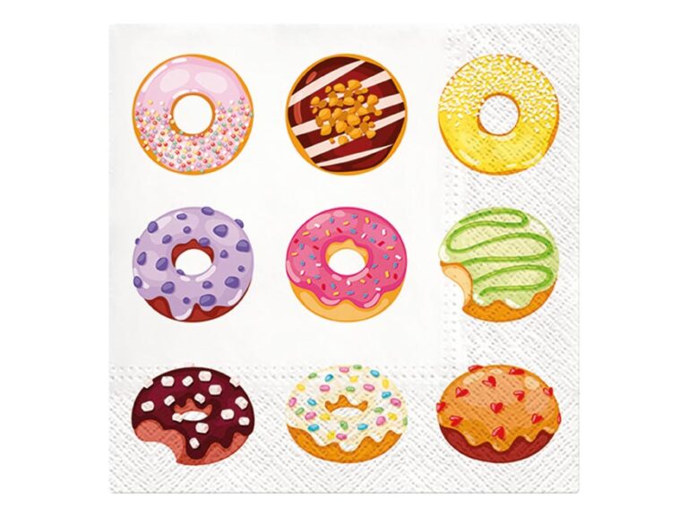 Třívrstvý papírový ubrousek. Krásné kvalitní ubrousky s motivem různých donutů a koblížků na bílém