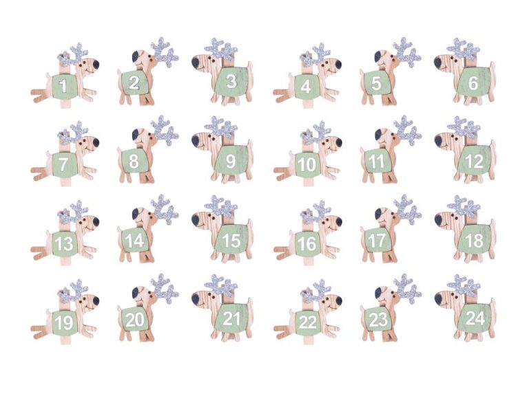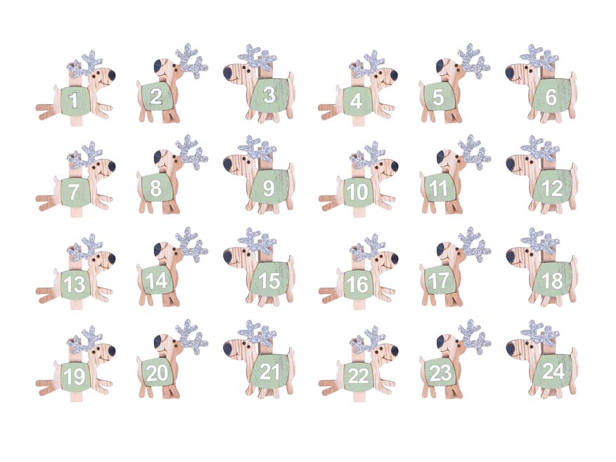 Dřevěné kolíčky se soby. Vytvořte si originální, adventní kalendář pomocí dřevěných kolíčků se soby s čísly. Navodí Vám tak tu správnou vánoční atmosféru.