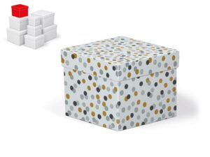 Celoroční dárková krabice o rozměrech 33 x 23,5 x 9 cm NÁHODNÝ MIX Dárková krabice v mixu barev se zlatými puntíky. Vhodná pro slavnostní příležitosti, dekorativní účely, balení osobních darů nebo k uschování různých drobností. Při vložení jedné krabičky do košíku se automaticky přidá celá sada, která zahrnuje krabičky s různými designy a velikostmi. Tato variabilita zaručuje, že budete mít krabičky vhodné pro různé příležitosti a typy dárků. Krabičky jsou elegantně navrženy a ladí k sobě svými barvami a vzory, čímž vytvářejí harmonickou sadu ideální pro každou příležitost. Materiál: 1,5 mm karton, potažený papírem s potiskem Set obsahuje tyto krabice: 5371115 Krabice dárková D-L002-A 14,5x10x5cm 5371116 Krabice dárková D-L002-B 17x12x5,5cm 5371117 Krabice dárková D-L002-C 19x13,5x6cm 5371118 Krabice dárková D-L002-D 22x16x6,5cm 5371119 Krabice dárková D-L002-E 24,5x17,5x7cm 5371120 Krabice dárková D-L002-F 27,5x19,5x7,5cm 5371121 Krabice dárková D-L002-G 29x21x8cm 5371122 Krabice dárková D-L002-H 33x23,5x9cm 5371123 Krabice dárková D-L002-I 35x25x10cm 5371124 Krabice dárková D-L002-J 37x27x11cm Uvedená cena je za 1 ks.