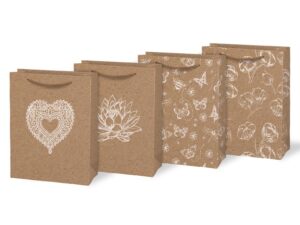 S jemnými bílými vzory a provázkovými uchy promění každé překvapení v malý designový zážitek. Perfektní volba pro každou příležitost – od narozenin po svatby a díky přírodnímu vzhledu zaujmou svou jednoduchou elegancí.