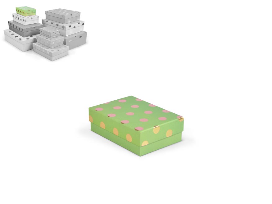 Dárková krabice v mixu barev se zlatými puntíky. Vhodná pro slavnostní příležitosti, dekorativní účely, balení osobních darů nebo k uschování různých drobností. Při vložení jedné krabičky do košíku se automaticky přidá celá sada, která zahrnuje krabičky s různými designy a velikostmi. Tato variabilita zaručuje, že budete mít krabičky vhodné pro různé příležitosti a typy dárků. Krabičky jsou elegantně navrženy a ladí k sobě svými barvami a vzory, čímž vytvářejí harmonickou sadu ideální pro každou příležitost.