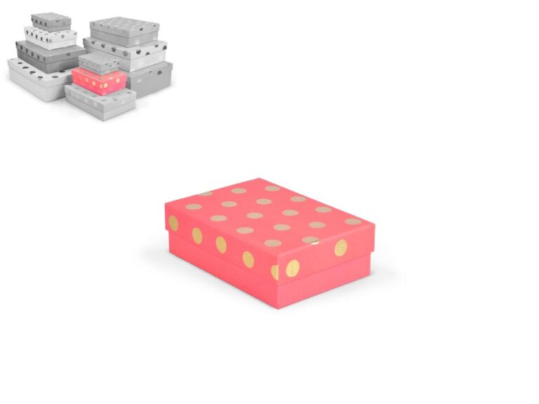 Dárková krabice v mixu barev se zlatými puntíky. Vhodná pro slavnostní příležitosti, dekorativní účely, balení osobních darů nebo k uschování různých drobností. Při vložení jedné krabičky do košíku se automaticky přidá celá sada, která zahrnuje krabičky s různými designy a velikostmi. Tato variabilita zaručuje, že budete mít krabičky vhodné pro různé příležitosti a typy dárků. Krabičky jsou elegantně navrženy a ladí k sobě svými barvami a vzory, čímž vytvářejí harmonickou sadu ideální pro každou příležitost.