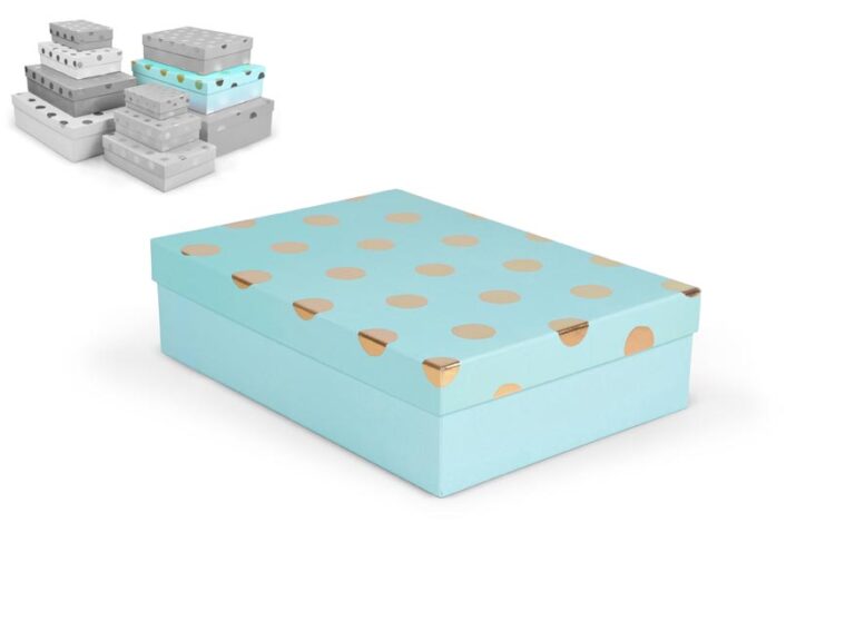 Dárková krabice v mixu barev se zlatými puntíky. Vhodná pro slavnostní příležitosti, dekorativní účely, balení osobních darů nebo k uschování různých drobností. Při vložení jedné krabičky do košíku se automaticky přidá celá sada, která zahrnuje krabičky s různými designy a velikostmi. Tato variabilita zaručuje, že budete mít krabičky vhodné pro různé příležitosti a typy dárků. Krabičky jsou elegantně navrženy a ladí k sobě svými barvami a vzory, čímž vytvářejí harmonickou sadu ideální pro každou příležitost.