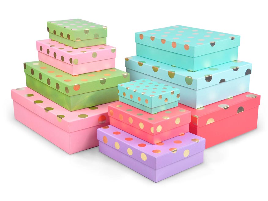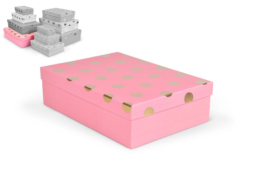 Dárková krabice v mixu barev se zlatými puntíky. Vhodná pro slavnostní příležitosti, dekorativní účely, balení osobních darů nebo k uschování různých drobností. Při vložení jedné krabičky do košíku se automaticky přidá celá sada, která zahrnuje krabičky s různými designy a velikostmi. Tato variabilita zaručuje, že budete mít krabičky vhodné pro různé příležitosti a typy dárků. Krabičky jsou elegantně navrženy a ladí k sobě svými barvami a vzory, čímž vytvářejí harmonickou sadu ideální pro každou příležitost.