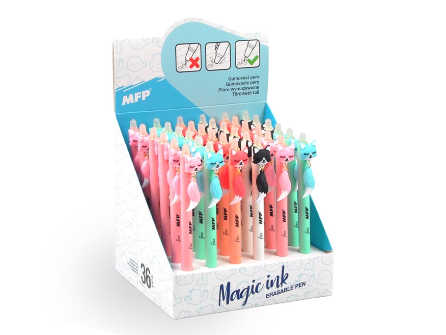 Gumovací, kuličkové pero s liškou obsahuje speciální inkoust tzv. vymaž a přepiš, nebo vymaž a nech znovu objevit. Pokud uděláte chybu, stačí jen otočit pero a plastovou špičkou text vymažete. Špička zahřeje inkoust, ten zmizí a lze je znovu přepsat. Můžete si psát i tajné vzkazy, po vygumování stačí jen papír ochladit pod bod mrazu a text se znovu objeví. Tato vymazatelná propiska je balena v papírovém stojanu po 20 ks.