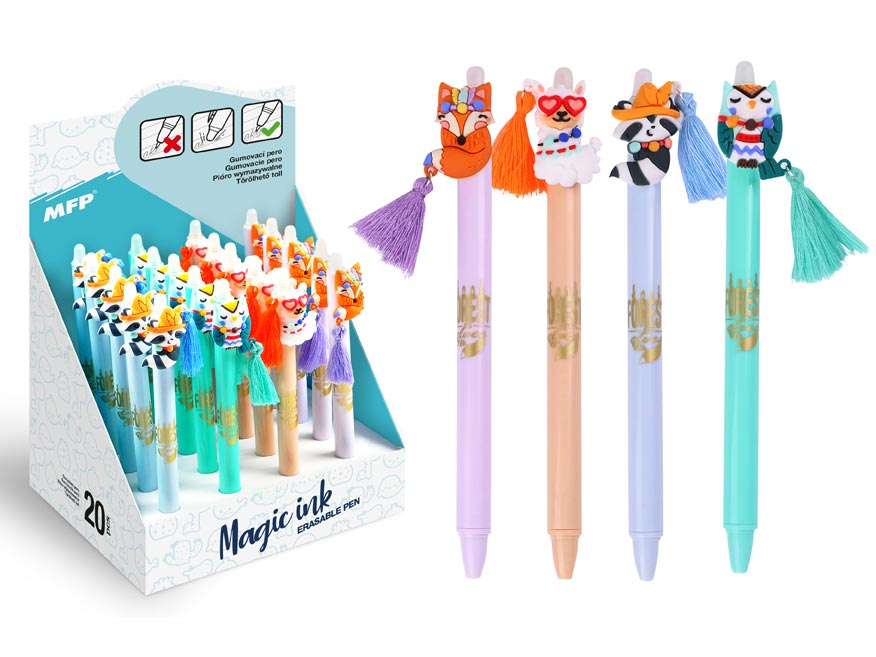 Gumovací, kuličkové pero se zvířaty obsahuje speciální inkoust tzv. vymaž a přepiš, nebo vymaž a nech znovu objevit. Pokud uděláte chybu, stačí jen otočit pero a plastovou špičkou text vymažete. Špička zahřeje inkoust, ten zmizí a lze je znovu přepsat. Můžete si psát i tajné vzkazy, po vygumování stačí jen papír ochladit pod bod mrazu a text se znovu objeví. Tato vymazatelná propiska je balena v papírovém stojanu po 20 ks.
