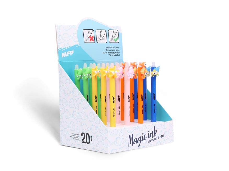 Gumovací gelové kuličkové pero s motivem moře obsahuje speciální inkoust tzv. vymaž a přepiš, nebo vymaž a nech znovu objevit. Pokud uděláte chybu, stačí jen otočit pero a plastovou špičkou text vymažete. Špička zahřeje inkoust, ten zmizí a lze je znovu přepsat. Můžete si psát i tajné vzkazy, po vygumování stačí jen papír ochladit pod bod mrazu a text se znovu objeví. Tato vymazatelná propiska je balena v papírovém stojanu po 20 ks.