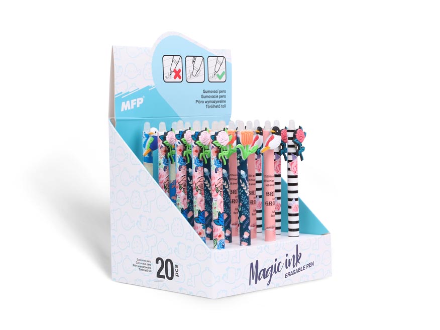 Gumovací gelové kuličkové pero s motivem květin a ptáků obsahuje speciální inkoust tzv. vymaž a přepiš, nebo vymaž a nech znovu objevit. Pokud uděláte chybu, stačí jen otočit pero a plastovou špičkou text vymažete. Špička zahřeje inkoust, ten zmizí a lze je znovu přepsat. Můžete si psát i tajné vzkazy, po vygumování stačí jen papír ochladit pod bod mrazu a text se znovu objeví. Tato vymazatelná propiska je balena v papírovém stojanu po 20 ks.