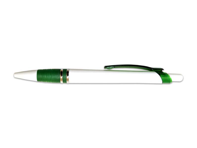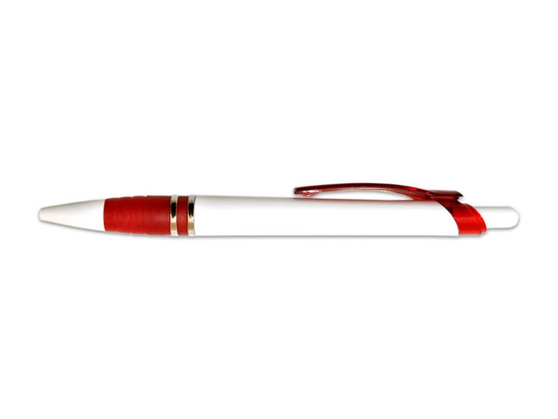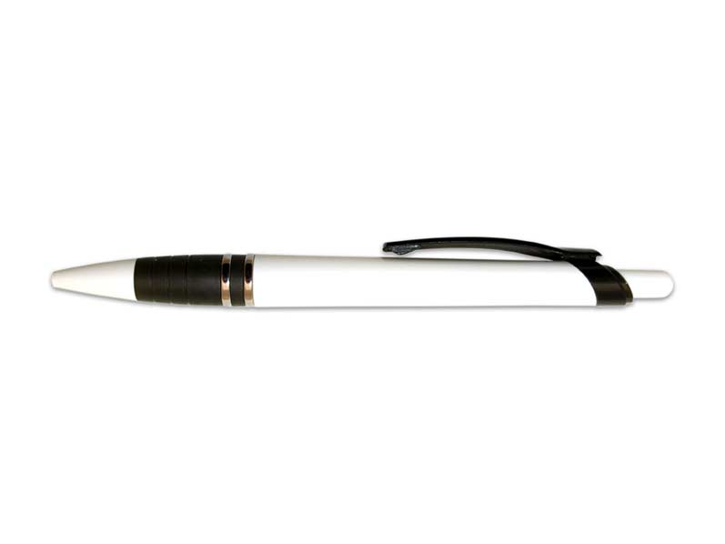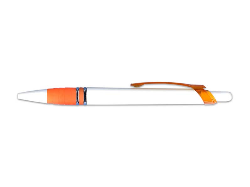 Plastové, kuličkové pero GP7105W s klipem. Pogumovaný úchop propisky zabraňuje klouzání pera v ruce.