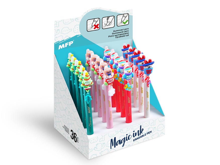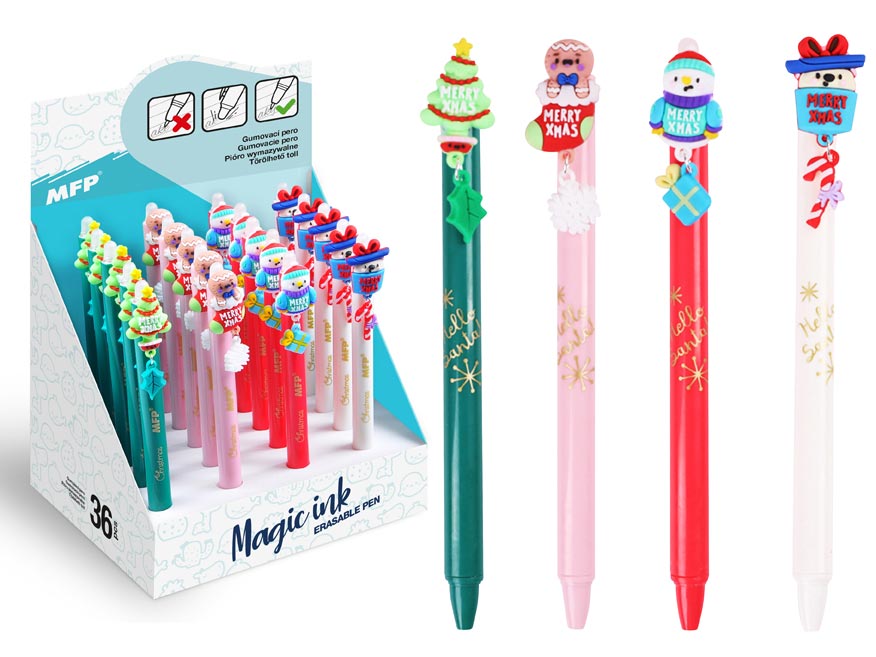 Gumovací, kuličkové pero s motivem vánoc obsahuje speciální inkoust tzv. vymaž a přepiš, nebo vymaž a nech znovu objevit. Pokud uděláte chybu, stačí jen otočit pero a plastovou špičkou text vymažete. Špička zahřeje inkoust, ten zmizí a lze je znovu přepsat. Můžete si psát i tajné vzkazy, po vygumování stačí jen papír ochladit pod bod mrazu a text se znovu objeví. Tato vymazatelná propiska je balena v papírovém stojanu po 36 ks.