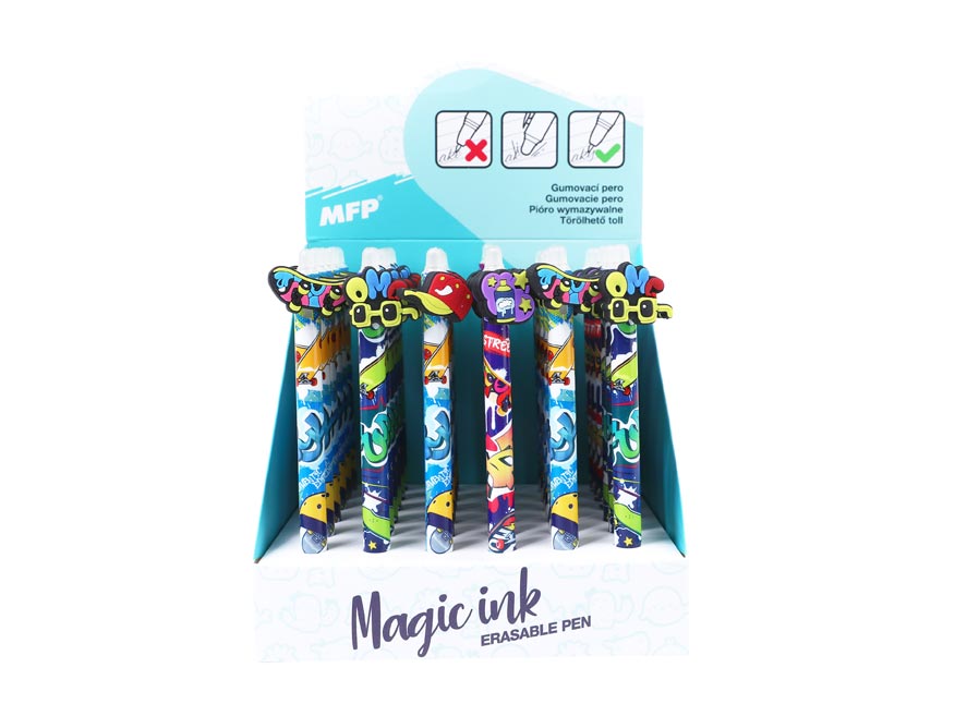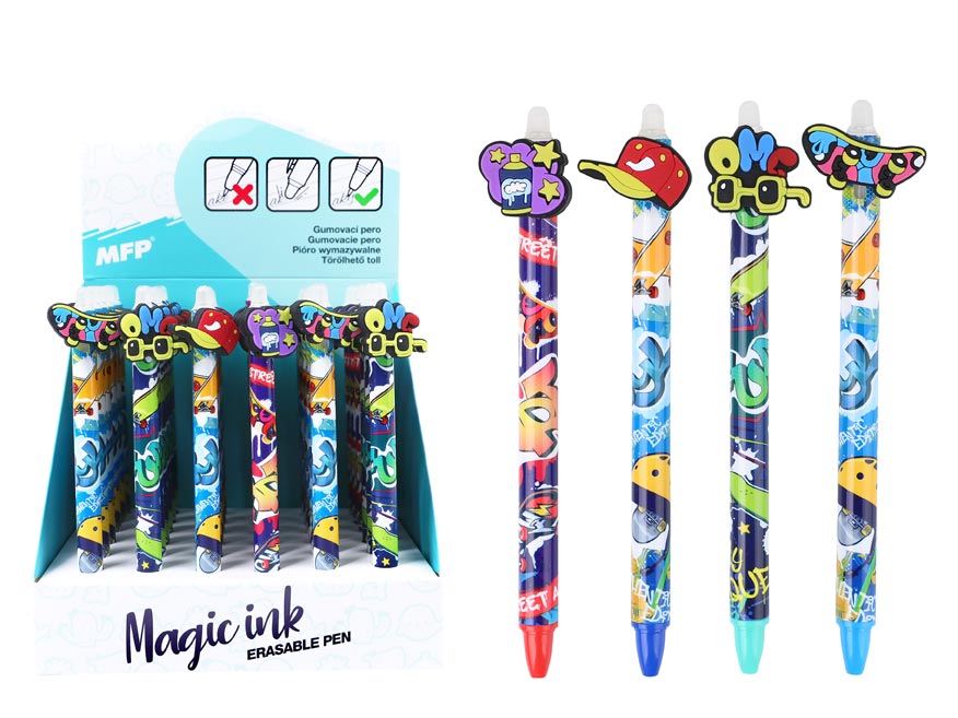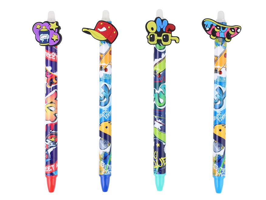Gumovací kuličkové pero s motivy street art přináší hravý a moderní vzhled inspirovaný pouličním stylem. Každé pero je ozdobeno různými prvky, jako jsou kreslená baseballová čepice, sluneční brýle s nápisem “OMG”, graffiti nápis a skateboard. Pero je vybaveno jemným hrotem o tloušťce 0,5 mm a speciálním inkoustem, který lze snadno vymazat pomocí integrované gumy na konci pera. Je ideální pro psaní poznámek, úkolů nebo zápisků do deníčků a plánovačů. Využití najde především ve škole či v kanceláři, kde oceníte možnost snadno opravit chyby bez potřeby korektoru.