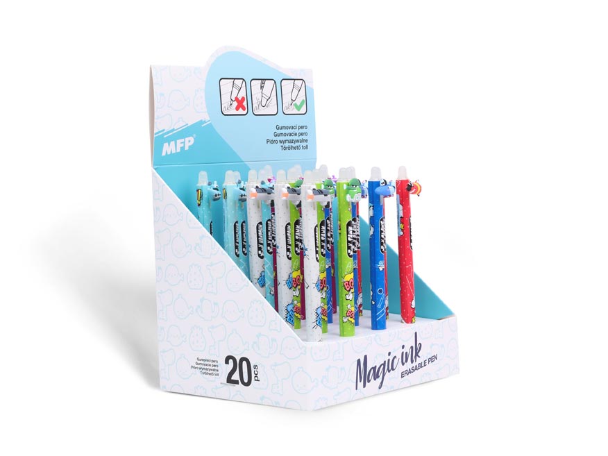 Gumovací gelové kuličkové pero obsahuje speciální inkoust tzv. vymaž a přepiš, nebo vymaž a nech znovu objevit. Pokud uděláte chybu, stačí jen otočit pero a plastovou špičkou text vymažete. Špička zahřeje inkoust, ten zmizí a lze je znovu přepsat. Můžete si psát i tajné vzkazy, po vygumování stačí jen papír ochladit pod bod mrazu a text se znovu objeví. Tato vymazatelná propiska je balena v papírovém stojanu po 20 ks.