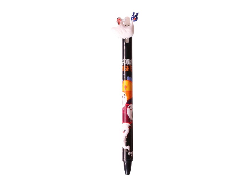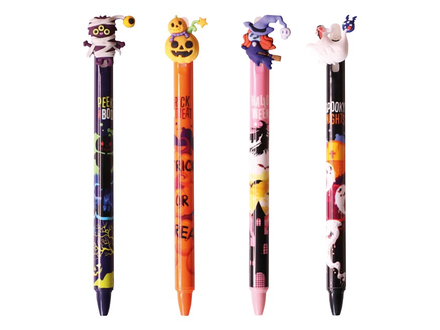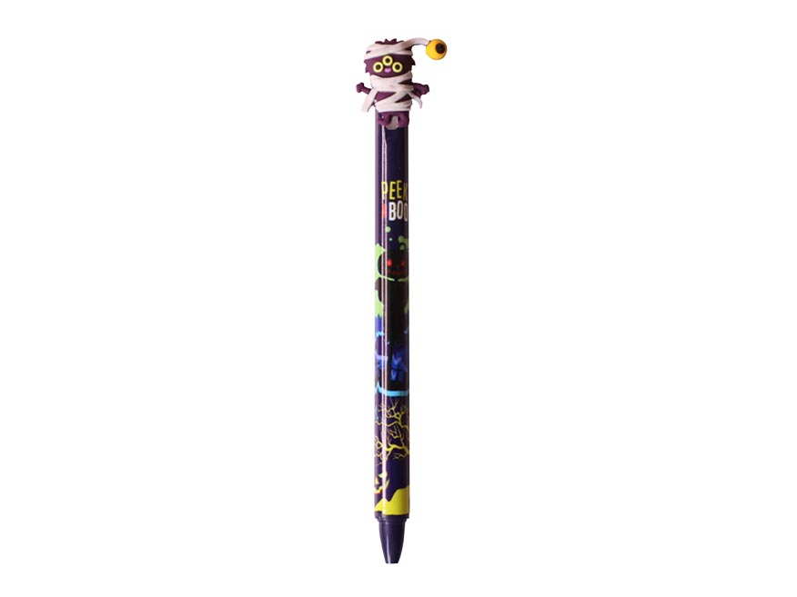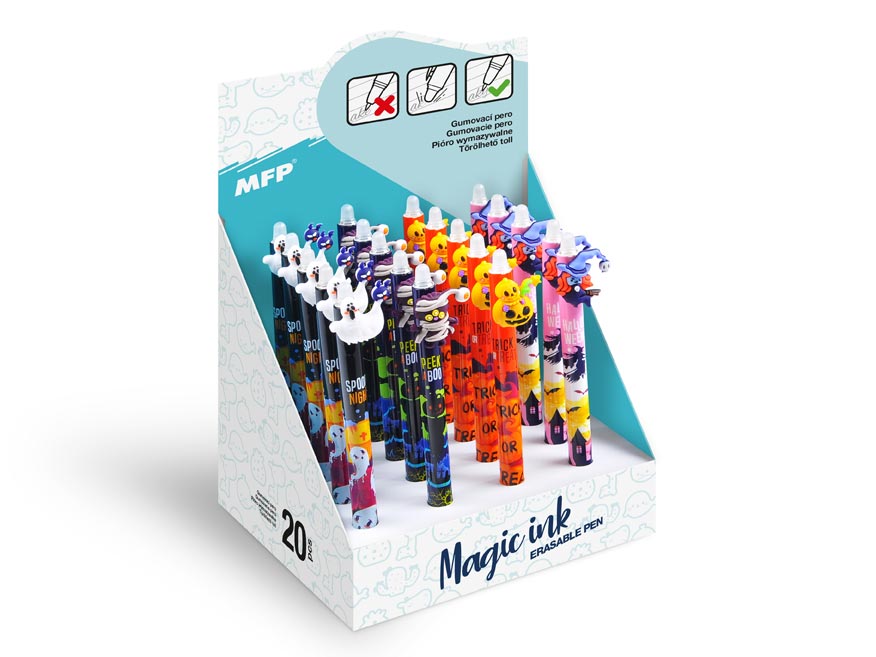 Gumovací kuličkové pero se strašidly obsahuje speciální inkoust tzv. vymaž a přepiš, nebo vymaž a nech znovu objevit. Pokud uděláte chybu, stačí jen otočit pero a plastovou špičkou text vymažete. Špička zahřeje inkoust, ten zmizí a lze je znovu přepsat. Můžete si psát i tajné vzkazy, po vygumování stačí jen papír ochladit pod bod mrazu a text se znovu objeví. Tato vymazatelná propiska je balena v papírovém stojanu po 20 ks.