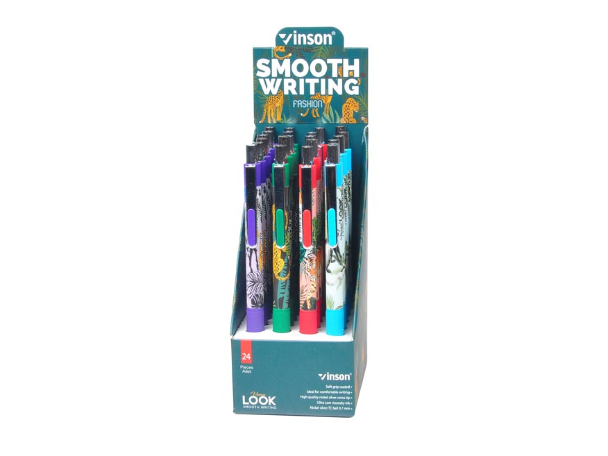 Kuličkové pero v mixu barev a motivů s hrotem o tloušťce 0,7 mm, který zajišťuje jemné a přesné psaní. Pero je vybaveno náplní se speciálním olejovým inkoustem, který zlepšuje plynulost psaní a zároveň zamezuje rozmazávání. Tělo propisky je ozdobeno různými vzory inspirovanými divokými zvířaty, například zebrou, gepardem, tygrem nebo nosorožcem. Mechanismus propisky je klikací, s kovovým zakončením na obou koncích. Tento model propisky je ideální pro ty, kteří mají rádi kreativní a barevné psací potřeby s motivy přírody.
