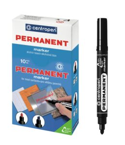 10/  permanentní popisovač, píše na většinu povrchů, odolá vodě, otěru, povětrnostním vlivům, alkoholová báze, válcový hrot, šířka stopy 1 mm