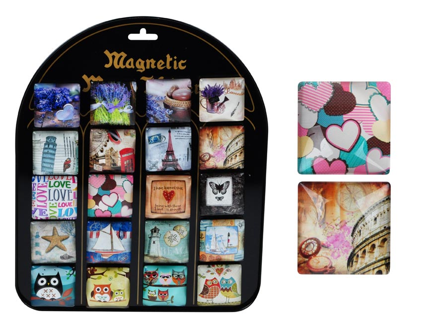 Skleněné a čtveraté dekorační magnety ve 20 různých provedeních (mix kvítí, srdíček, mořských motivů, soviček, světových památek)