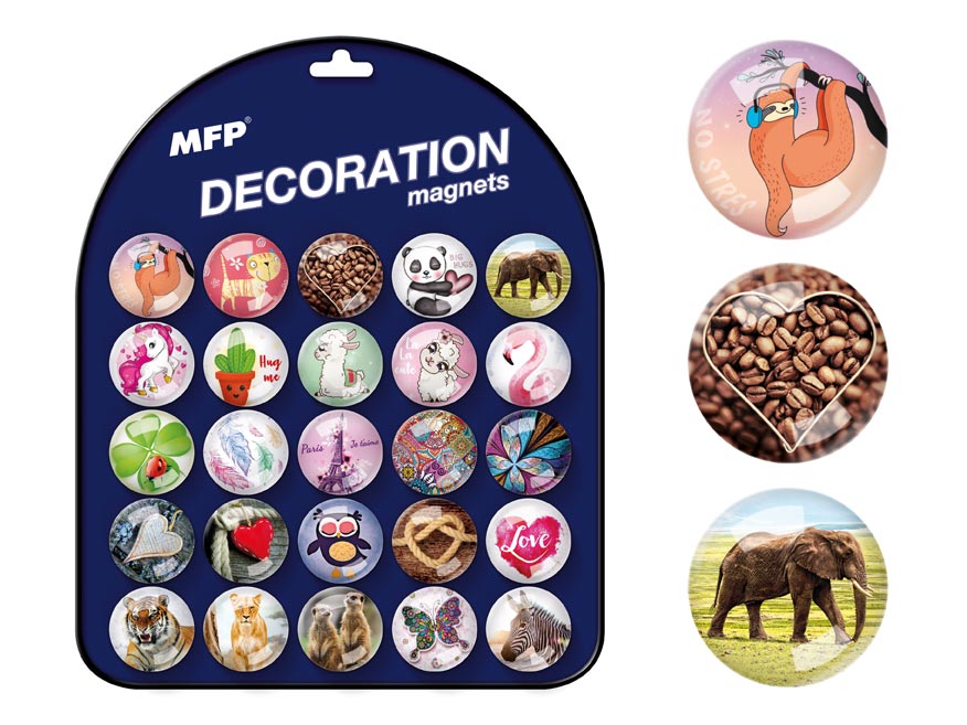Skleněný, dekorační, kulatý magnet v různých motivech, na magnetické tabulce je 25 různých designů.